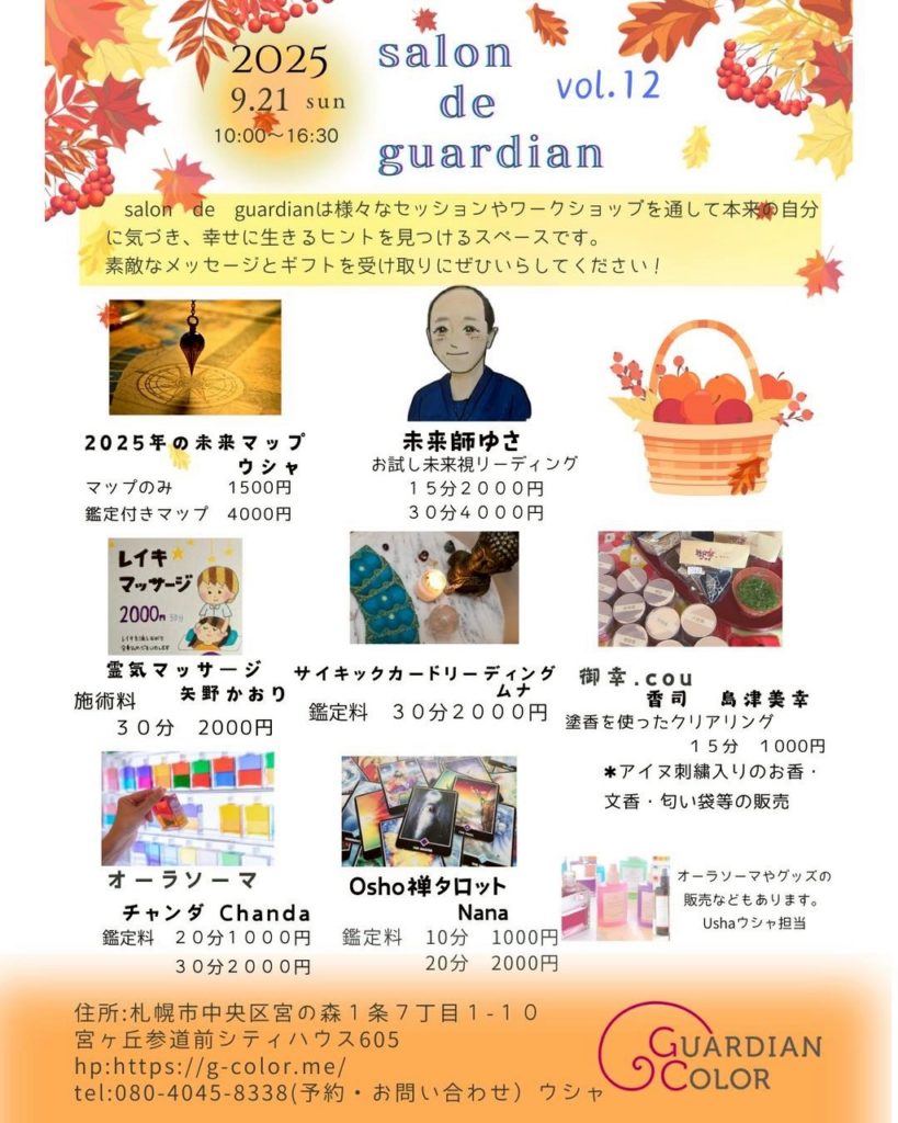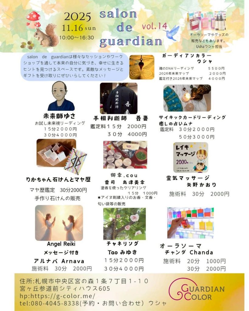 こんにちは。御幸.cou 島津美幸 です。2025年11月16日(日)に、salon de guardian 主催のワークショップに出店いたします。他には占星術やタロット、オーラソーマなど鑑定も受けて頂けます。また、各グッズも販売しております。 【11月16日(日)salon de... -